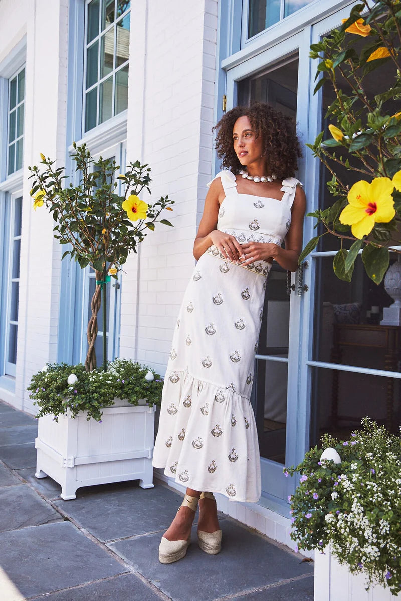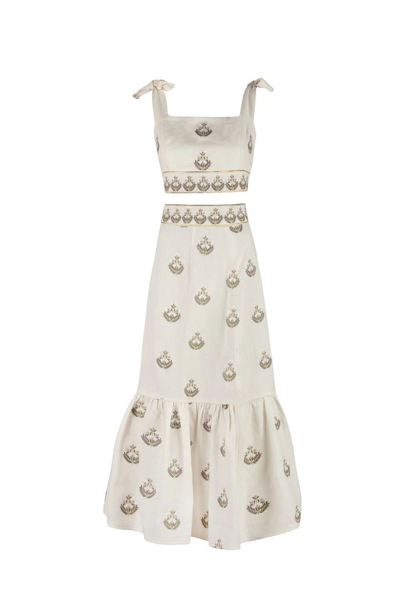 Made from a soft Ivory, this is the ultimate feminine dress for a that overdue luncheon with your ladies, or that bridal shower or garden party you've been waiting to turn some heads at. Featuring silk-thread embroidery and adjustable bow straps along the back and the shoulders, this ensemble is bound to fit like a glove.
