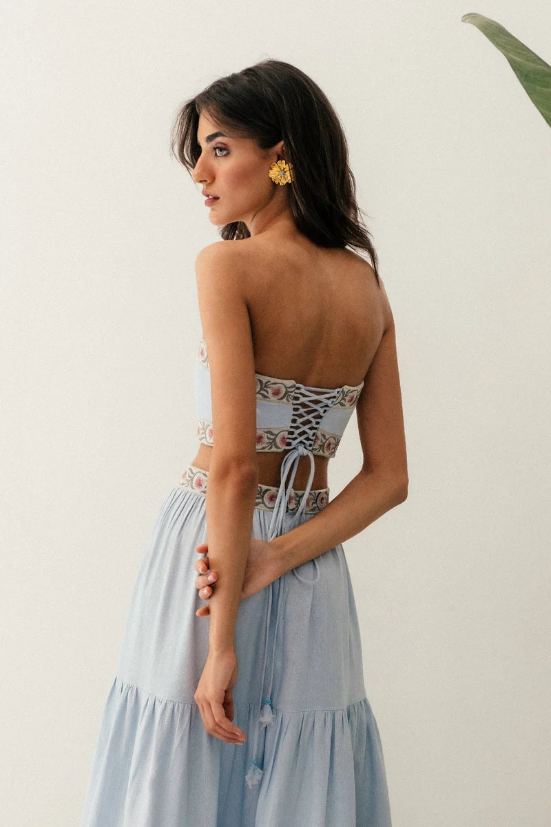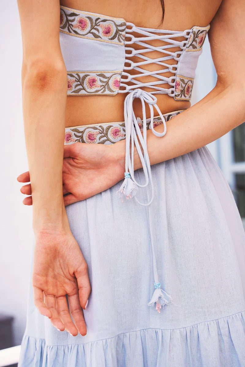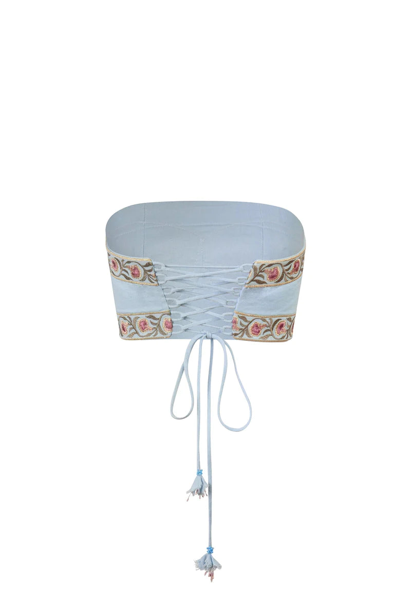 A new take on our signature bustier tops, the carnation top is intricately embroidered with our iconic carnation pattern. Featuring a laced bustier closure on the back with delicate handmade floral details on the tassels.