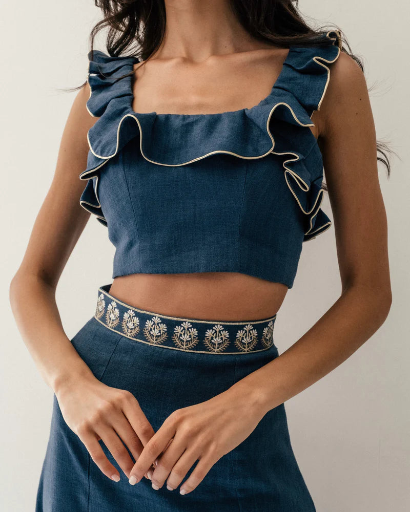 A new take on our signature Malika tops, this ruffled bustier has been uodated to feature a longer bustier silhouette, with three ties in the back for a perfrct adjustable fit. Our signature gold piping around the trim elevates this linen piece with a chic but understated flair.